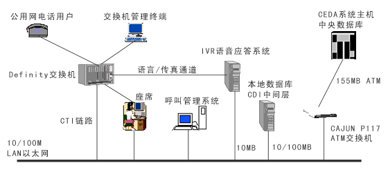浦東機(jī)場呼叫中心系統(tǒng)建有本地?cái)?shù)據(jù)庫,但有許多信息需與中央數(shù)據(jù)庫交換。所以依托高速的ATM主干網(wǎng)絡(luò),利用基于TCP/IP網(wǎng)絡(luò)協(xié)議的CDI(CEDA