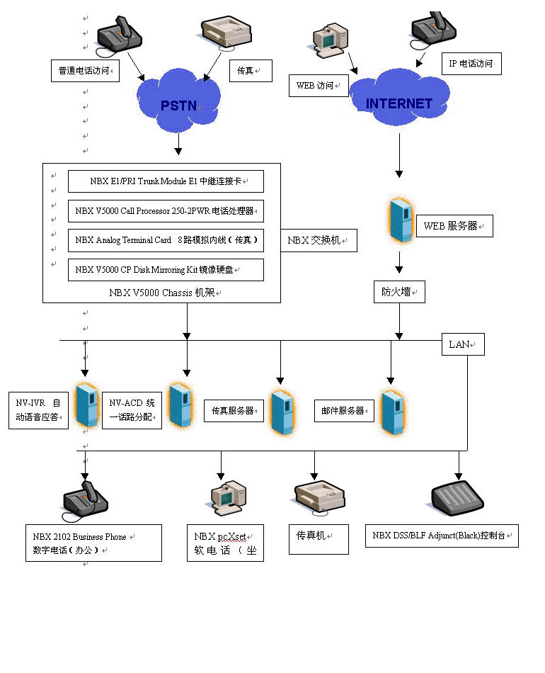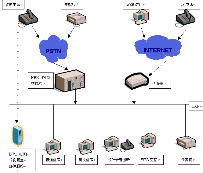 基于NBX的呼叫中心對外支持PSTN、IP兩種接入方式,可以實現各種接入:普通電話、傳真、IP電話、郵件、WEB訪問,NBX呼叫中心在技術上實現革命性的突破,在內部實行語音數據兩網合一,將外部的模擬數據轉換為以太網數據包,由NV-ACD實現外部各種訪問的統(tǒng)一路由分配。