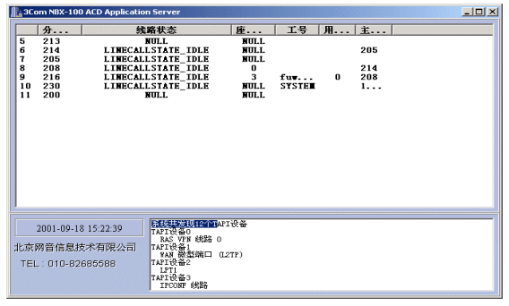NBX呼叫中心的核心設備是3Com公司的NBX網絡交換機,NBX網絡交換機支持開放式電話開發(fā)平臺TAPI2.X,TAPI它是Microsoft電話技術應用程序編程界面標準,運用TAPI可以方便、高效地完成針對語音線路的控制開發(fā),從而完成自動語音應答(IVR)、自動話路分配(ACD)、以及坐席接待、計費、錄音等需求。使用TAPI這種標準使得用戶可以集成第三方CTI程序以完成各種高級需求。