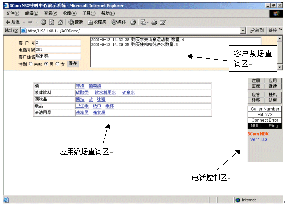 NV-AGENTControl和NV-AGENTPad。NV-AGENTControl是基于ActiveX的Ocx控件,利用該控件,第三方開發(fā)商可以自行開發(fā)界面,非常簡單地實現座席工號注冊、呼叫應答、電話外撥等功能。NV-AGENTPad是在NV-AGENTControl之上開發(fā)的一個座席應用解決方案,它通過瀏覽器方式運行,第三方開發(fā)商基本上可以不進行任何有關呼叫控制方面的開發(fā),就可以將自己的應用系統(tǒng)和NBX系統(tǒng)完整集成。