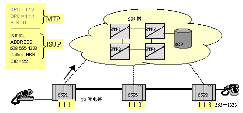 當(dāng)消息(IAM)到達(dá)路由中下一個(gè)交換點(diǎn)1.1.2時(shí),MTP層再次分析路由。在1.1.2中,MTP查找目的信令點(diǎn)編碼,并發(fā)現(xiàn):這個(gè)消息不是發(fā)給自己的,然后就找出轉(zhuǎn)發(fā)這個(gè)消息的路由及具體的鏈路。