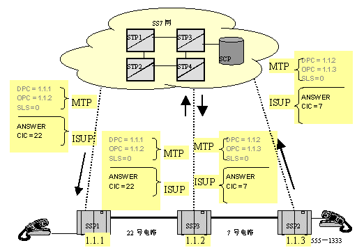 SS7協(xié)議的MTP層完成發(fā)送消息路由方面的所有工作,包括查路由表,發(fā)送DPC,源信令點(diǎn)(SSP1)編碼,以及占用的電路號(hào)CIC。ISUP層處理IAM消息,包括主被叫號(hào)碼信息。