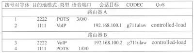 第2部分在清單4中描述,它提供語音連接的實質(zhì)內(nèi)容,語音端口簡單地標(biāo)識它們連接到的設(shè)備。撥號對等體1把電話號碼分配給物理語音端口,撥號對等體2定義VoIP呼叫到站點B。在語音端口3/0/0上啟動回聲消除功能。IP優(yōu)先級設(shè)置為5,設(shè)置資源預(yù)留協(xié)議RSVP為controlled-load,確保即使帶寬發(fā)生擁塞與過載時,數(shù)據(jù)流也能得到優(yōu)先處理。而且因為多余的帶寬,語音活動檢測被禁止了,并為撥號點配置了語音編碼速率—64000bps。