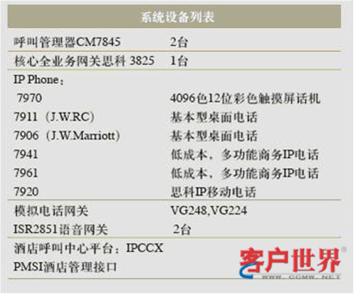 目前整個(gè)酒店IP電話系統(tǒng),采用兩個(gè)7845Call Manger,提供互相冗余備份。一套PMSI酒店管理接口,酒店呼叫中心平臺(tái):IPCCX,兩臺(tái)ISR2851語(yǔ)音網(wǎng)關(guān)。酒店還為每個(gè)客房提供一部7970彩屏IP終端,同時(shí)為了顧客的方便還在床頭還提供一部7906或者7911IP電話終端,足見酒店的體貼周到。酒店辦公管理和客服中心分別使用7941和7961,同時(shí)為了移動(dòng)方便,酒店還采用了Wi-Fi設(shè)計(jì),目前在酒店后臺(tái)管理采用了7920無線IP電話終端。