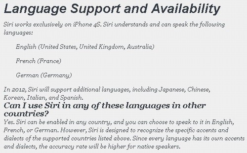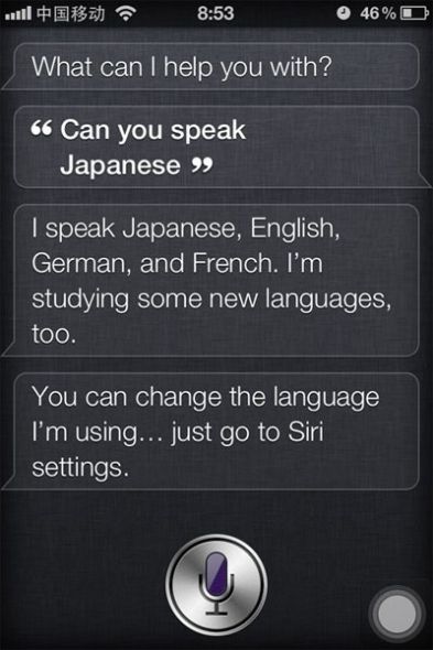 去年10月Siri發(fā)布時(shí),其FAQ文件顯示,2012年它將支持日語(yǔ)、中文、漢語(yǔ)、意大利語(yǔ)和西班牙語(yǔ)。