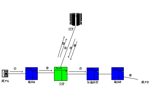 、 發(fā)起端局接受呼叫并根據(jù)用戶A撥打的接入碼(如962855)將呼叫選路至業(yè)務(wù)交換點SSP;