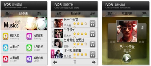 6)彩鈴定制業(yè)務。傳統(tǒng)彩鈴定制業(yè)務基于純語音IVR的環(huán)境下使用起來非常繁瑣,進行彩鈴檢索比較麻煩,選擇的準確度也很低。手機客戶端軟件的應用,提供了可視化的交互方式,讓業(yè)務使用起來直觀便捷很多。用戶通過聲動魅力完成彩鈴信息的瀏覽、試聽、定制過程,用戶可以邊瀏歌曲的同時邊聽到語音對歌曲的介紹,并可試用該歌曲。下圖即為彩鈴定制業(yè)務操作界面: