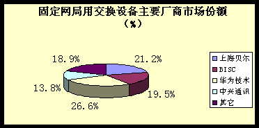 (2)市場特點:市場份額進一步向業(yè)內(nèi)領(lǐng)先者集中,華為技術(shù)、上海貝爾、BISC 依然保持該領(lǐng)域三甲地位,市場份額占市場總量的67.3%。上述三家廠商各自的市場份額分別占到市場總量的26.6%、21.2%、19.5%。 此外,以中興通訊 、華為技術(shù)為代表的非外資設(shè)備廠商積極開拓國外市場以實現(xiàn)其國際化發(fā)展戰(zhàn)略。 中心城市市場趨于飽和,市場競爭焦點向本地網(wǎng)機型拆換和中小城市以下市場轉(zhuǎn)移。激烈的價格競爭導(dǎo)致該市場平均利潤微薄。