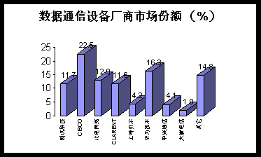 (2)市場特點:由于非外資設(shè)備廠商的崛起,數(shù)據(jù)通信產(chǎn)品價格持續(xù)下降,中低端產(chǎn)品競爭尤為激烈。華為、中興等公司在高端接入服務(wù)器、路由器等領(lǐng)域已取得突破,市場份額穩(wěn)步攀升,在高端接入服務(wù)器領(lǐng)域,非外資品牌已占到60%以上的份額。IP網(wǎng)絡(luò)設(shè)備繼續(xù)被CISCO等少數(shù)公司壟斷、非外資廠商試圖有所作為但收效甚微。運營商高漲的投資熱情與設(shè)備廠商的大力推動,是數(shù)據(jù)產(chǎn)品市場迅速擴張的拉動力量,網(wǎng)絡(luò)帶寬的不足以及運營商Qos的局限依然是該市場飛躍發(fā)展的瓶頸因素。