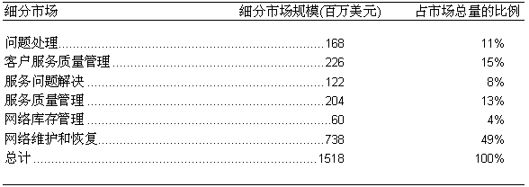 如圖二所示, 2000年, 在美國的固定網(wǎng)OSS服務(wù)保障市場的六個細(xì)分市場中, 規(guī)模最大的是網(wǎng)絡(luò)維護和恢復(fù)市場, 市場總額約為7.38億美元, 占整個市場的49%; 而規(guī)模最小的是網(wǎng)絡(luò)庫存管理市場, 市場總額約為6千萬美元, 僅占整個市場的4%左右。
