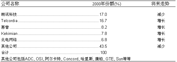 從目前市場情況來看,美國的固定網(wǎng)OSS服務(wù)保障的市場集中度相當(dāng)高。在市場中領(lǐng)先的公司一共有5家,它們分別是朗訊科技、Telcordia科技、惠普公司、Hekimian和北電網(wǎng)絡(luò)。這五家公司均是較早進(jìn)入這一市場的老牌公司。2000年,它們在固定網(wǎng)OSS服務(wù)保障領(lǐng)域的銷售額總和為8.60億美元,約占整個市場的56.5%左右,另外43.5%的市場被約其他二十多家廠商分割。