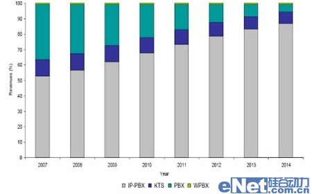 隨著中國經濟的高速發(fā)展,企業(yè)通信市場也將保持一定的發(fā)展速度。Frost & Sullivan數(shù)據(jù)顯示,從2007年到2014年,國內企業(yè)通信市場年均復合增長率為5.9%,到2014年市場規(guī)模約為4.82億美元。其中,企業(yè)IP通信市場將保持高速發(fā)展態(tài)勢,年均復合增長率將達到13.7%,市場規(guī)模將從2007年的1.71億美元增長到2014年的4.19億美元。屆時,IP通信將擁有整個企業(yè)通信市場86.9%的市場份額。傳統(tǒng)的PBX及KTS市場將持續(xù)萎縮。