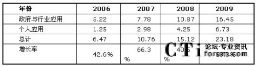 如圖1所示,F(xiàn)rost & Sullivan認(rèn)為,由于個人應(yīng)用領(lǐng)域的商業(yè)模式還未成熟,產(chǎn)業(yè)鏈整合仍在進行中,目前移動位置服務(wù)應(yīng)用仍然以政府和企業(yè)應(yīng)用為主。如圖4所示,2009年個人應(yīng)用市場規(guī)模為6.73億元,而政府與行業(yè)應(yīng)用市場達到16.45億元,兩者總計達23.18億元,同比去年增長了53.3%。