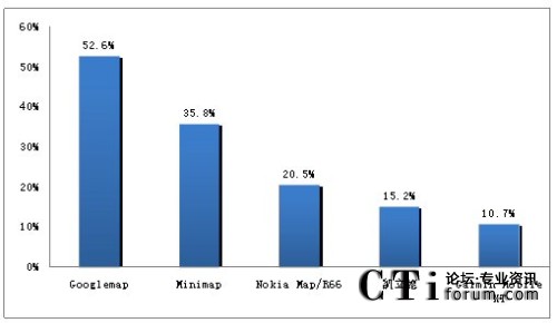 如圖1所示,在用戶占有方面,使用率最高的是谷歌的Googlemap,總計有52.6%的用戶使用該軟件;其次是高德的迷你地圖,使用率達35.8%,排名第二;Nokia
