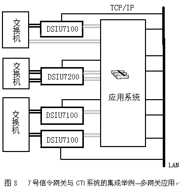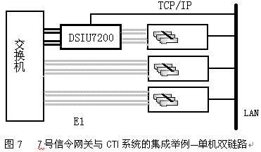 。。7號信令網(wǎng)關(guān)支持多條SS7信令鏈路。7號信令網(wǎng)關(guān)能夠檢測出攜帶SS7信令消息的時隙,加以處理,通過TCP/IP輸出到LAN上。相似地,7號信令網(wǎng)關(guān)從TCP/IP