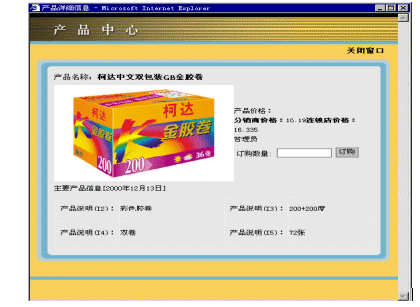 在用戶選擇一個分類時,此分類下的產(chǎn)品將會被列出。用戶可以直接在想要購買的產(chǎn)品后填寫購買數(shù)量,一次可以填寫多個產(chǎn)品。這樣在處理產(chǎn)品訂購的時候,大大的提高了效率。同樣,用戶也可以點擊詳細信息鏈接查看產(chǎn)品的詳細信息(參看圖2)。