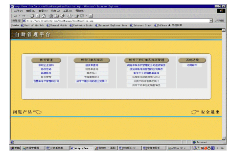 ebanswers分銷系統(tǒng)的一個重要特色就是自助管理平臺,用戶可以在這個平臺中完成絕大部分管理、查詢和統(tǒng)計的工作。自助管理平臺主要有四大部分組成:帳號管理、公司下訂單和庫存管理、帳號下訂單和庫存管理、其他功能。其中帳號管理主要是管理與公司和帳號有關(guān)的各類信息,公司下訂單和庫存管理、帳號下訂單和庫存管理這兩個部分主要是用來查詢和統(tǒng)計各項信息的。