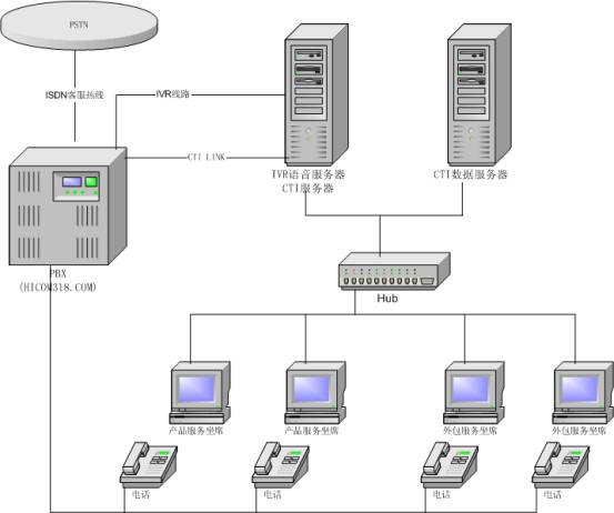 Siemens Hicom318.com交換機(jī):接入ISDN中繼線,設(shè)置人工座席分機(jī),為CTI,IVR語(yǔ)音服務(wù)器提供16路IVR端口和CTI LINK控制電纜。
