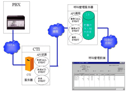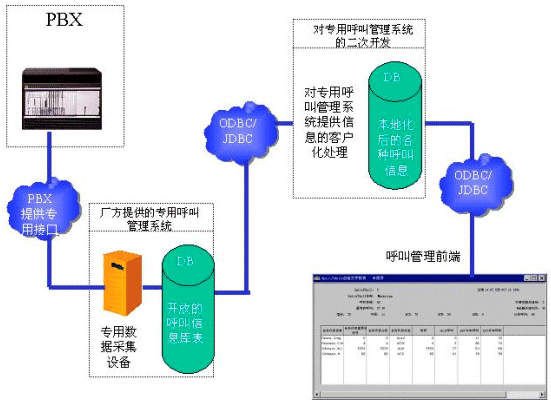 一般來說,各大有能力推出PBX產(chǎn)品的通訊廠商都有自己專用的呼叫管理系統(tǒng)。這些專用的呼叫管理系統(tǒng)可以直接從PBX獲取最高效的消息,而不用通過CTI SERVER。當然,這些專用的呼叫管理系統(tǒng)也只能應(yīng)用于專門的PBX產(chǎn)品。 如果運營商在選購設(shè)備的時候,已經(jīng)選購了專用的呼叫管理系統(tǒng),那么開發(fā)商可以對這個專門的呼叫管理系統(tǒng)進行二次開發(fā)。請看下面的數(shù)據(jù)流程圖: