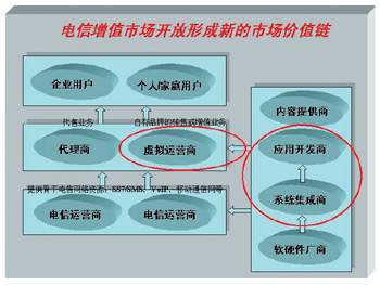 在電信增值市場開放的背景之下,新的市場價(jià)值鏈正在形成(如圖所示)。國內(nèi)電信建設(shè)轟轟烈烈的大規(guī);A(chǔ)設(shè)施投資已是明日黃花,改善應(yīng)用“稀缺”的現(xiàn)狀才是當(dāng)務(wù)之急。李峻認(rèn)為,信息產(chǎn)品技術(shù)服務(wù)提供商最主要的任務(wù),就是幫助運(yùn)營商開發(fā)針對中國市場的增值業(yè)務(wù),并帶動(dòng)其主業(yè)協(xié)同發(fā)展。即面向電信網(wǎng)絡(luò)運(yùn)營商以及虛擬運(yùn)營商,提供增值業(yè)務(wù)系統(tǒng)整體解決方案及其軟硬件支撐平臺和應(yīng)用系統(tǒng)。