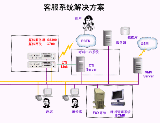 采用AVAYA S8300交換機做為客戶服務(wù)中心的核心電話接入平臺,系統(tǒng)中配置CTI接口模塊和內(nèi)置的自動呼叫分配軟件包。