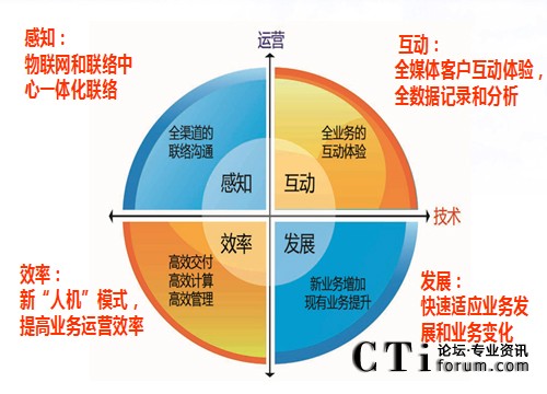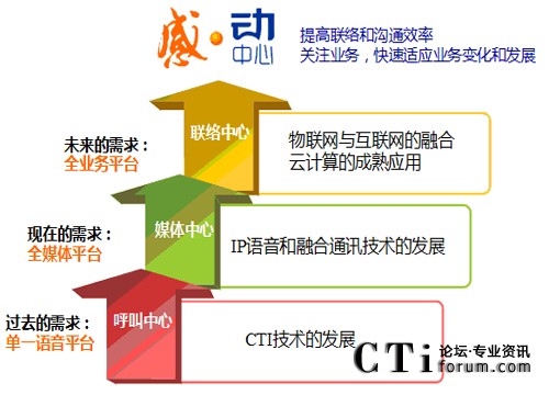 這是“感•動(dòng)中心”的主旨,完全以客戶的業(yè)務(wù)為出發(fā)點(diǎn),體現(xiàn)“以客戶為中心”的理念。而“全景中心”、“聯(lián)絡(luò)中心”等以純技術(shù)為中心,還停留在多媒體通訊和UC通訊手段融合層面,只是新增加了一些新方式的接入等技術(shù),對(duì)于客戶業(yè)務(wù)的融合和適應(yīng),并沒(méi)有任何提升。