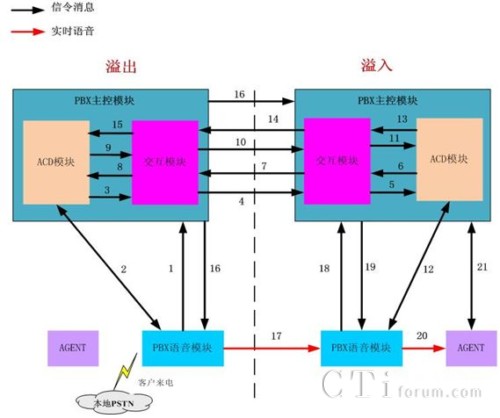 通過(guò)PBX/ACD建立一種電話路由共享和語(yǔ)音溢出的方法,實(shí)現(xiàn)多套聯(lián)絡(luò)中心平臺(tái)之間語(yǔ)音的動(dòng)態(tài)互溢,透明地為客戶提供優(yōu)質(zhì)、及時(shí)的電話服務(wù),客戶感覺(jué)不到任何差異。通過(guò)PBX/ACD建立一種電話路由共享和語(yǔ)音溢出的方法,作為行業(yè)現(xiàn)有實(shí)現(xiàn)方法的有效補(bǔ)充,解決了行業(yè)現(xiàn)有實(shí)現(xiàn)方法的無(wú)法實(shí)現(xiàn)最短路徑溢出問(wèn)題,通過(guò)ACD的“先排隊(duì)后進(jìn)門”的預(yù)約預(yù)定模式,動(dòng)態(tài)判斷彼此的運(yùn)行狀態(tài)和處理能力,無(wú)需先將語(yǔ)音溢出到另外一個(gè)聯(lián)絡(luò)中心,只有當(dāng)另外一個(gè)聯(lián)絡(luò)中心確定能提供相應(yīng)的語(yǔ)音服務(wù)和人工服務(wù)的時(shí)候,語(yǔ)音才在PBX語(yǔ)音層面通過(guò)標(biāo)準(zhǔn)通信協(xié)議進(jìn)行互聯(lián)互通,避免實(shí)時(shí)語(yǔ)音被多次溢出,實(shí)時(shí)實(shí)時(shí)語(yǔ)音溢出只走最短路徑,保證客戶電話只需一次溢出就能立即提供語(yǔ)音服務(wù)和人工服務(wù),大幅減少了語(yǔ)音溢出的處理時(shí)間,同時(shí)也大幅減少了語(yǔ)音處理次數(shù),提升了系統(tǒng)處理性能。