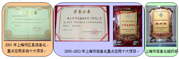去年,徐匯區(qū)政府憑借其"市民咨詢服務(wù)(呼叫)中心",脫穎而出,一舉獲得"2001年上海市區(qū)縣信息化重點(diǎn)應(yīng)用系統(tǒng)十大項(xiàng)目"大獎;今年,在新近上海市政府進(jìn)行的信息化評比中,徐匯區(qū)政府又榮獲兩項(xiàng)大獎,分別是"上海市信息化組織"和"2000~2002年上海市信息化重點(diǎn)應(yīng)用十大項(xiàng)目"。上海市市委書記陳良宇親自頒發(fā)獎項(xiàng)。