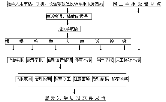 導(dǎo)航語:咨詢有關(guān)投訴舉報(bào)受理范圍請(qǐng)按1,咨詢有關(guān)受理說明請(qǐng)按2,咨詢科室分工請(qǐng)按3,咨詢投訴舉報(bào)注意事項(xiàng)請(qǐng)按4,咨詢書信舉報(bào)請(qǐng)按5,咨詢當(dāng)面舉報(bào)請(qǐng)按6,電話錄音舉報(bào)請(qǐng)按7,傳真舉報(bào)請(qǐng)按8,人工接聽舉報(bào)請(qǐng)按9,查詢舉報(bào)處理結(jié)果請(qǐng)按0
