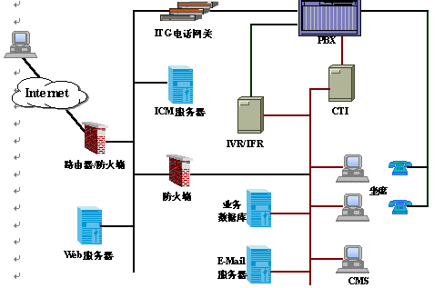 呼叫匯接平臺(帶ACD排隊機軟件)、語音/傳真服務平臺、Web應用平臺、座席應用平臺、數據支撐平臺、網絡支撐平臺。