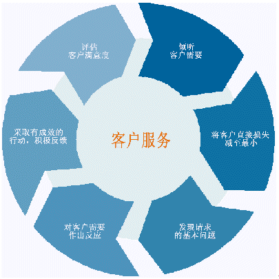客戶服務(wù)不僅限于把公司提供給客戶使用?蛻舴⻊(wù)是與客戶交互的一個完整過程,包括聽取客戶的問題和要求,對客戶的需要作出反應(yīng)并探詢客戶新的需求。我們真的不能將其看成一個簡單的過程。客戶服務(wù)可以用一個復雜的循環(huán)來表示,其中不僅僅包括了客戶和客戶服務(wù)部門,實際上包括了整個公司,即把公司整體作為一個受客戶需求驅(qū)動的對象。