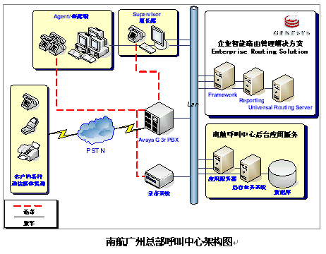eSOON & Genesys為南航提供的解決方案包括:Genesys 平臺架構(gòu)(Framework),以及ERS企業(yè)智能路由解決方案(Enterprise Routing Solution)。建成以廣州為中心,全國分布而集中式接近200坐席的呼叫中心,并于本年開始進(jìn)行語音/數(shù)據(jù)聯(lián)網(wǎng)。