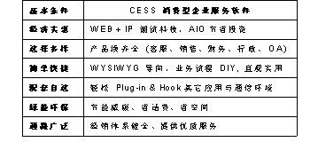 CESS消費(fèi)型服務(wù)軟件具有經(jīng)濟(jì)實(shí)惠、選擇多樣、簡單快捷、配套自選、綠能環(huán)通路廣泛等特點(diǎn),采用Web+IP的潮流科技,AIO節(jié)省投資,使軟件經(jīng)濟(jì)實(shí)惠;CESS軟件產(chǎn)品線齊全,涵蓋客服、銷售、財(cái)務(wù)、行政、OA等很多方面,給您多樣選擇;WYSIWYG(所見即所得)導(dǎo)向,業(yè)務(wù)流程DIY,讓您至需要動動鼠標(biāo)就可以DIY您想要得到的設(shè)計(jì),不再需要麻煩IT人員,只管實(shí)用,簡單快捷;輕松Plug-in & Hook其它應(yīng)用與通信環(huán)境,可根據(jù)您的需要配套自選;節(jié)能減碳、省話費(fèi)、省空間,綠色環(huán)保;經(jīng)銷體系健全、提供優(yōu)質(zhì)服務(wù),通路廣泛。