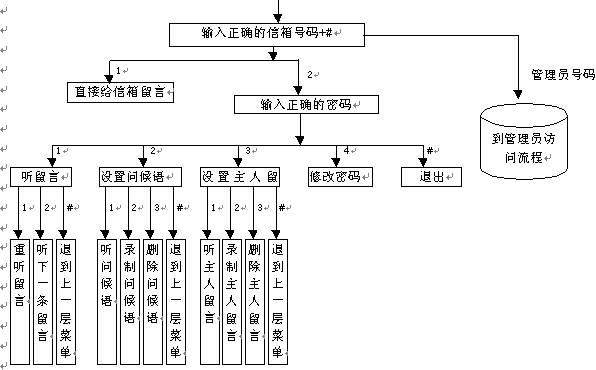 作為信箱主人的用戶既可以象其它普通用戶一樣進行普通用戶訪問(指訪問其它分機、給其它分機主人留言等),還可以使用系統(tǒng)專門提供的主人訪問服務(wù)功能。