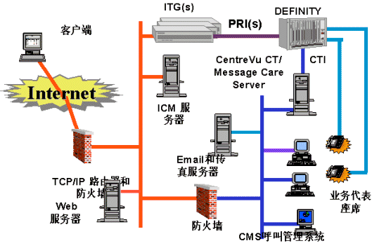 Internet呼叫中心(Internet Call Center簡稱ICC)是當(dāng)前的一個(gè)明顯趨勢。支持因特網(wǎng)作為呼叫中心的訪問渠道會(huì)極大增強(qiáng)呼叫中心的可用性。Internet用戶可以通過主頁瀏覽、電子郵件、在線Chat、IP語音電話等方式與話務(wù)員建立在線聯(lián)系,得到優(yōu)質(zhì)的服務(wù)。AVAYA的Internet呼叫中心解決方案支持用戶采用一條電話線進(jìn)行因特網(wǎng)和IP電話的訪問,ICM管理器與Web服務(wù)器建立連接,將到來的IP呼叫進(jìn)行自動(dòng)分配,ITG IP電話網(wǎng)關(guān)實(shí)現(xiàn)將IP語音流轉(zhuǎn)換成語音信號,經(jīng)E1線送到Definity交換機(jī)后傳到話務(wù)員座席。座席和用戶可實(shí)現(xiàn)瀏覽器同步等功能。