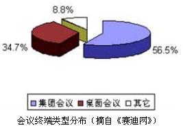 視頻會(huì)議的功能主要包括音視頻功能和數(shù)據(jù)共享功能。數(shù)據(jù)共享是指通過(guò)視頻會(huì)議系統(tǒng)使身處異地的合作者相互了解情況并共享數(shù)據(jù)應(yīng)用(例如電子白板、共享文檔、協(xié)同瀏覽等)。根據(jù)對(duì)視頻會(huì)議功能側(cè)重點(diǎn)的不同,視頻會(huì)議系統(tǒng)分為視頻會(huì)議終端(也稱集團(tuán)會(huì)議終端)和網(wǎng)絡(luò)會(huì)議終端(也稱桌面會(huì)議終端)。視頻會(huì)議終端經(jīng)過(guò)專門(mén)設(shè)計(jì),功能完善,安裝在特定的會(huì)議室中,不能隨意移動(dòng),能夠?qū)崿F(xiàn)復(fù)雜的視頻會(huì)議;網(wǎng)絡(luò)會(huì)議終端一般是經(jīng)過(guò)專門(mén)設(shè)計(jì)的個(gè)人計(jì)算機(jī),它既可以作為普通計(jì)算機(jī)使用,又可以作為會(huì)議終端,是實(shí)現(xiàn)會(huì)議、數(shù)據(jù)等綜合應(yīng)用的平臺(tái)。如下圖所示,集團(tuán)會(huì)議終端所占份額為56.5%,桌面會(huì)議終端為34.7%。網(wǎng)絡(luò)會(huì)議終端盡管發(fā)展時(shí)間不長(zhǎng),但由于其較好地集成了會(huì)議、數(shù)據(jù)等應(yīng)用,其市場(chǎng)份額也頗為可觀,而且近年來(lái)增長(zhǎng)十分迅速。