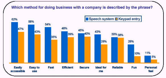 調(diào)查結(jié)果無可厚非地證明語音服務(wù)系統(tǒng)已被大部分消費者接受和使用,并且對其服務(wù)有著高度評價,它顯示了其他溝通方式,包括傳統(tǒng)的DTMF按鍵式系統(tǒng),電子郵件及互聯(lián)網(wǎng)絡(luò)服務(wù)等所不能比擬的極度優(yōu)勢。