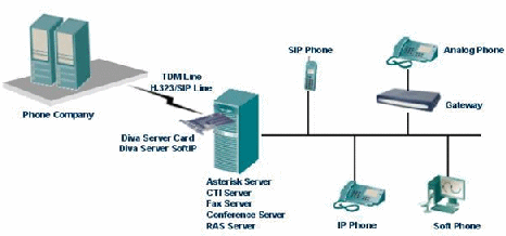 IAX/ MGCP/ H.323和Diva Server卡PSTN連接間充當(dāng)媒體網(wǎng)關(guān)(Media Gateway)的角色。