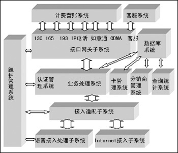 綜合付費(fèi)平臺的軟件邏輯結(jié)構(gòu)分為語音接入處理子系統(tǒng)、Internet 接入子系統(tǒng)、接入適配網(wǎng)關(guān)子系統(tǒng)、認(rèn)證管理子系統(tǒng)、業(yè)務(wù)處理系統(tǒng)、卡管理系統(tǒng)、分銷商管理系統(tǒng)、查詢統(tǒng)計(jì)系統(tǒng)、數(shù)據(jù)庫系統(tǒng)、接口網(wǎng)關(guān)子系統(tǒng)和維護(hù)管理子系統(tǒng)。