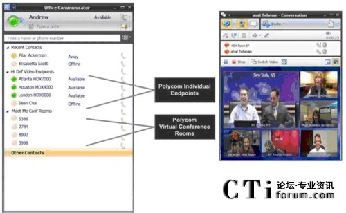 RMX 虛擬會(huì)議室出現(xiàn)在 Office Communicator 2007 聯(lián)系人列表上,用戶點(diǎn)擊即可加入多點(diǎn)通話。這樣, 商業(yè)用戶就可以在 PC 和高品質(zhì)視頻終端上輕松開展協(xié)作,并保持與各方隨時(shí)溝通。
