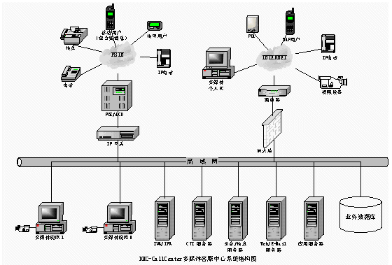 普通電話用戶通過PSTN接入DHC- UIPS綜合信息平臺系統(tǒng),接受話務(wù)員服務(wù)或自動業(yè)務(wù)流程。傳真用戶進入系統(tǒng)可以進行傳真業(yè)務(wù)。計算機用戶也可以通過Internet訪問企業(yè)客戶服務(wù)系統(tǒng)主頁,獲得服務(wù)。同時計算機用戶也可以通過Internet利用網(wǎng)絡(luò)電話的功能要求話務(wù)員服務(wù)或自動業(yè)務(wù)流程。