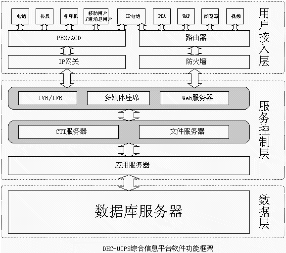 即DHC-UIPS綜合信息平臺的接入端,包括IVR流程、人工坐席等,它是用戶進入多媒體客服中心客服系統(tǒng)的入口,它將直接面對用戶并收集各種信息。支持電話、傳真、電子郵件、WEB訪問、WAP、PDA、IP電話、網(wǎng)絡(luò)電話、視頻電話等多種方式接入。