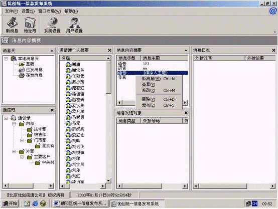 北京優(yōu)創(chuàng)信通科技公司基于完全自主版權(quán)的 SmartMessage Pro架構(gòu),將 Windows OutLook有機(jī)擴(kuò)展,是集CTI、TTS、CMPP、SMTP/POP3技術(shù)的統(tǒng)一消息轉(zhuǎn)換和發(fā)布一體化解決的產(chǎn)品,可以支持Intranet內(nèi)部網(wǎng)的電話語(yǔ)音/傳真、手機(jī)短信和Email消息的大量分發(fā)。