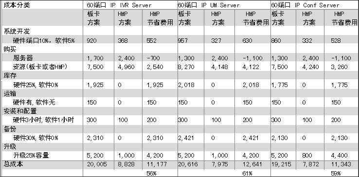 在眾多好處當中,對用戶最有吸引力的無疑是節(jié)省成本。張怡國特別強調,對一個應用系統(tǒng)而言,成本的計算不應該單以產品端口購買價格考核,而應該是系統(tǒng)總的建設成本,包括產品購買成本、服務器成本、運輸、安裝、庫存、升級等多項費用。基于HMP1.1版本,張怡國作了一個比較,以60端口IP IVR 60、端口IP UM或者60路會議為例,和語音板卡處理方式相比,基于HMP軟件實現(xiàn)能有近60%的成本節(jié)省,其中采購能節(jié)省20%,庫存節(jié)省20%,備份節(jié)省20%,升級節(jié)省近40%。