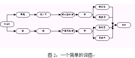 在語(yǔ)音識(shí)別中,語(yǔ)言模型是用來(lái)指導(dǎo)引擎進(jìn)行語(yǔ)音識(shí)別的,它限定了一個(gè)識(shí)別引擎所能表達(dá)的語(yǔ)句類型。在我們常用的圖搜索引擎中,語(yǔ)言模型是通過語(yǔ)法來(lái)表示的,語(yǔ)法是由一系列表示某個(gè)領(lǐng)域的語(yǔ)言表達(dá)方式的規(guī)則組成的(語(yǔ)法的具體書寫規(guī)則見引擎使用說(shuō)明書)。這些規(guī)則會(huì)被被轉(zhuǎn)換成詞圖的形式然后用來(lái)指導(dǎo)語(yǔ)音的識(shí)別。所謂的詞圖是指由詞作為節(jié)點(diǎn)的一個(gè)圖,從該圖的開始節(jié)點(diǎn)到末尾節(jié)點(diǎn)的任一條路徑都是一個(gè)有效合法的句子。圖2給出了一個(gè)簡(jiǎn)單的詞圖。