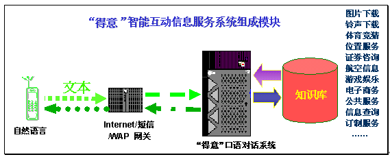 "得意口語對話系統"可以充分滿足互聯網、短信、WAP等業(yè)務的智能互動信息服務需求,為SP和用戶提供了更易用、好用、實用的信息交流平臺。