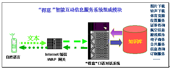 在現(xiàn)有的數(shù)據(jù)通信和信息服務(wù)的技術(shù)平臺(tái)上,加入"得意口語對(duì)話系統(tǒng)運(yùn)行平臺(tái)",就能夠讓用戶在通過Internet/SMS/WAP等各種通信手段,在電腦、手機(jī)等設(shè)備上以自然語言的形式享受相關(guān)領(lǐng)域的智能互動(dòng)信息服務(wù)。