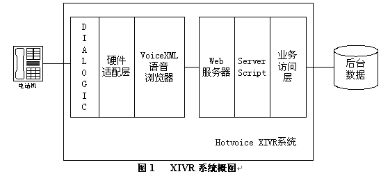 采用Hotvoice XIVR系統(tǒng)實(shí)現(xiàn)的新業(yè)務(wù)可以采用任何Web技術(shù)方便地和原有數(shù)據(jù)系統(tǒng)結(jié)合。用戶可以根據(jù)業(yè)務(wù)需求編寫靜態(tài)voiceXML腳本,或采用ASP/JSP/PHP等動態(tài)生成voiceXML腳本;與后臺數(shù)據(jù)系統(tǒng)間可以采用數(shù)據(jù)庫訪問,或采用XML/HTTP/DCOM或其他協(xié)議訪問。