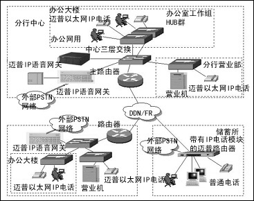 分行中心與下面的支行以及各儲(chǔ)蓄網(wǎng)點(diǎn)根據(jù)業(yè)務(wù)應(yīng)用需求出發(fā),可以利用邁普各系列路由器產(chǎn)品,通過(guò)DDN或者幀中繼把分行辦公大樓和營(yíng)業(yè)部、支行辦公大樓和營(yíng)業(yè)部、分行和支行下屬儲(chǔ)蓄所連起來(lái)。對(duì)于分行中心以及下面的支行,由于網(wǎng)絡(luò)結(jié)構(gòu)比較復(fù)雜,再加上網(wǎng)絡(luò)基礎(chǔ)設(shè)施建設(shè)已經(jīng)很完善,一般可以采用邁普IP語(yǔ)音網(wǎng)關(guān),通過(guò)它與原有的外部PSTN網(wǎng)絡(luò)相連。而對(duì)于一些較小的儲(chǔ)蓄網(wǎng)點(diǎn),則可以通過(guò)采用帶有IP電話模塊的邁普路由器。邁普路由器的IP電話模塊可與電話機(jī)或交換機(jī)相連,能夠支持G.711、G.723、G.729等多種語(yǔ)音壓縮算法,并且還支持H.323協(xié)議,實(shí)現(xiàn)IP電話功能。