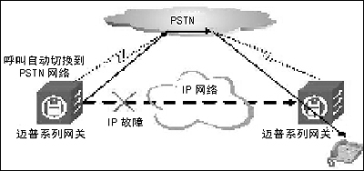 利用這一機(jī)制,網(wǎng)絡(luò)管理員也可以為每個(gè)撥號(hào)端配置一條備份路由,這個(gè)備份路由可以通往IP網(wǎng)方向也可以通向PSTN方向,當(dāng)主路由不通時(shí)路徑選擇算法就將自動(dòng)把下一次呼叫切換到備份路由,實(shí)現(xiàn)IP-PSTN切換。
